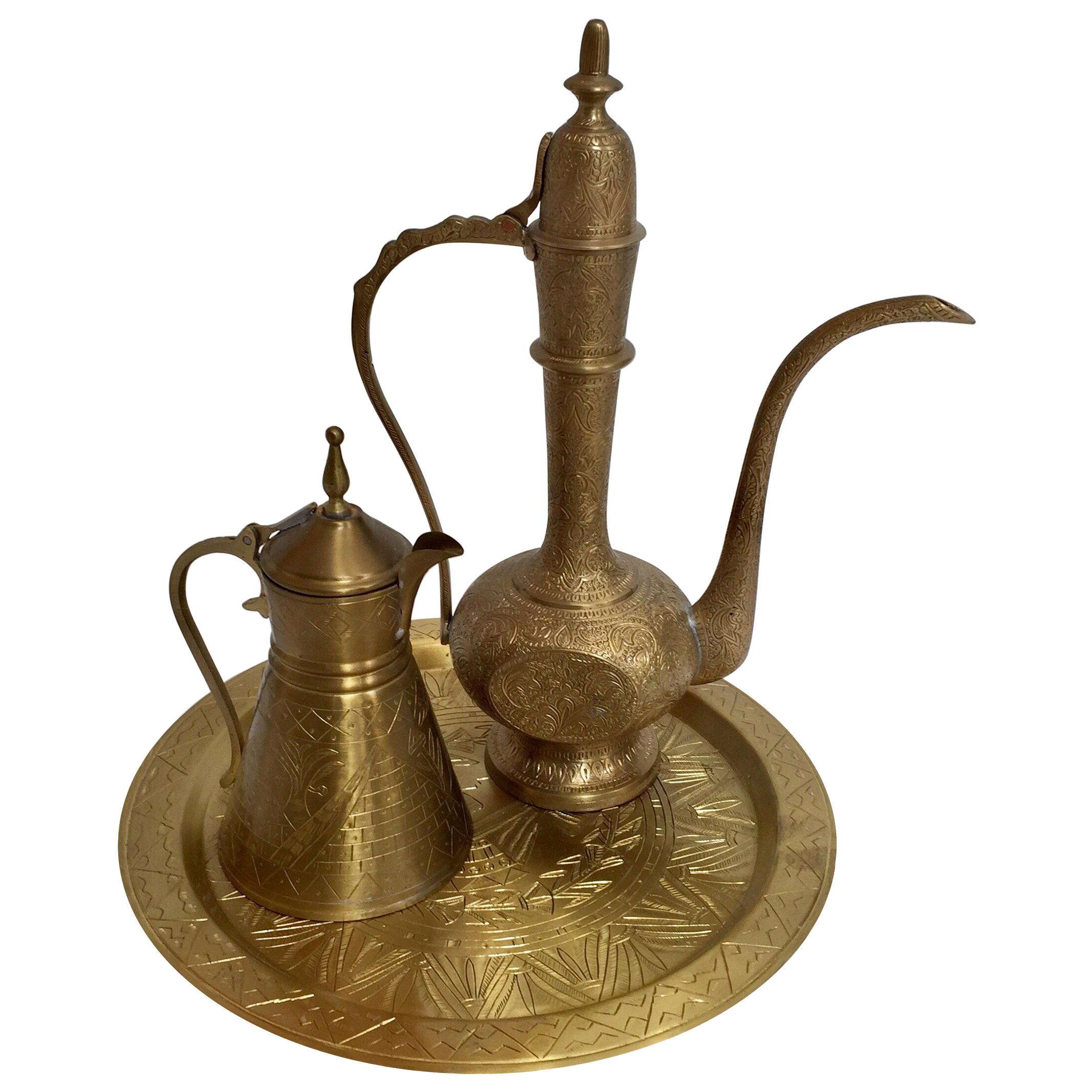 Middle Eastern Egyptian Arabic Polished Brass Coffee Set, Tray and